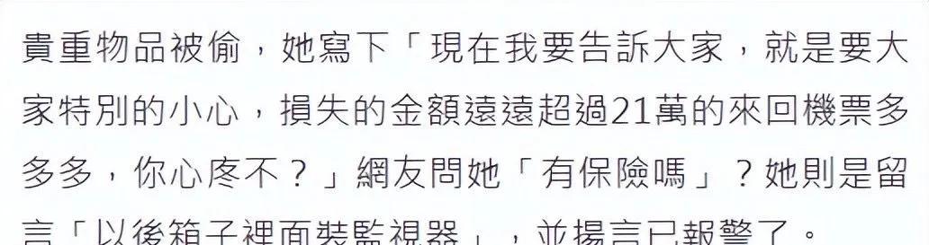 警察說破案有點難,因為監控沒拍到啥,更奇怪的是行李箱外表一點問題都沒,回家打開才看見里面全空了,網友問她買沒買保險,她說好像沒買,還開玩笑說以后要在箱子里裝個監控,但又馬上補了一句“你別太天真”。