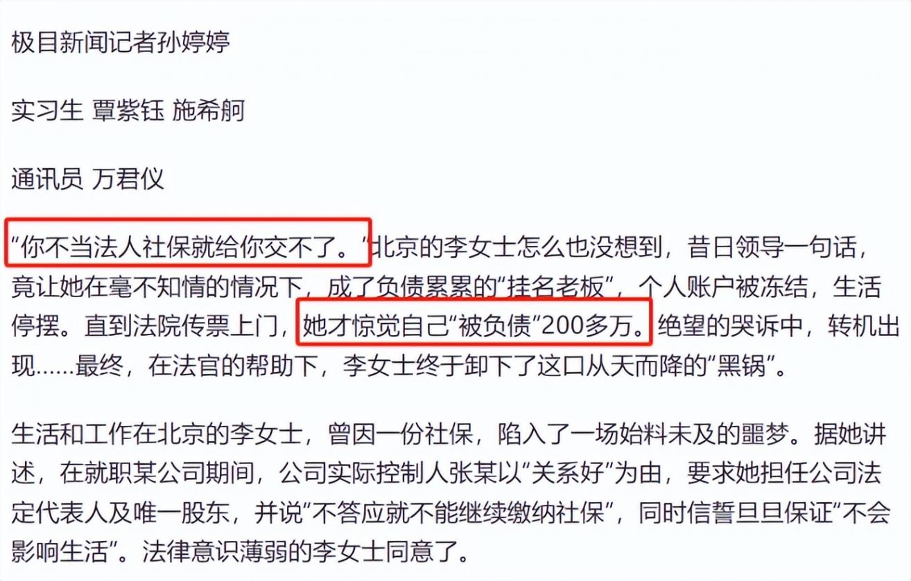 李女士把社??吹煤苤匾?,再想一想,對方也說了,只是掛個名字而已沒什么大事,還說在公司把她當(dāng)自己人。就這樣,李女士同意了。