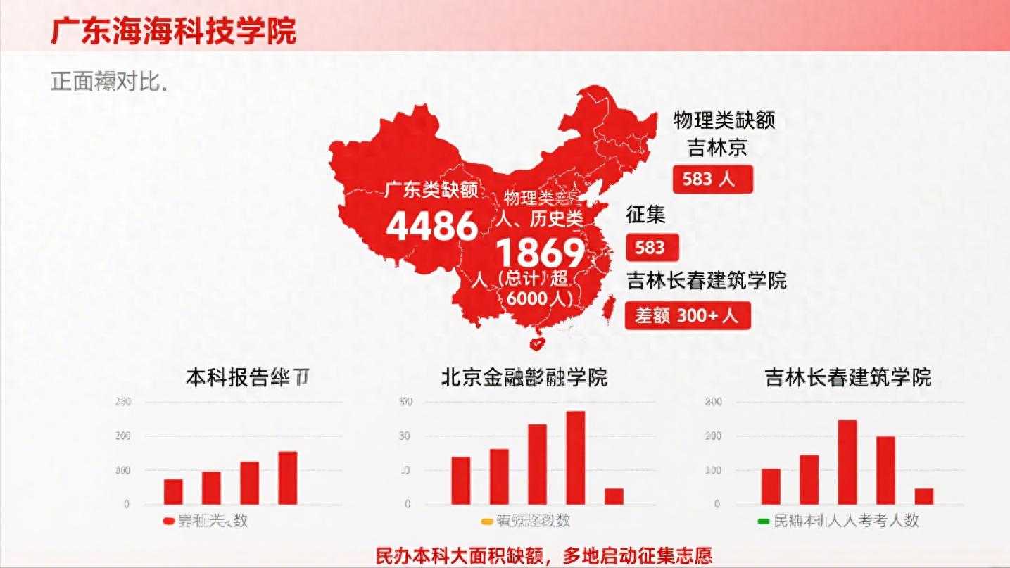 在廣東省外,北京市和吉林省的志愿征集中,同樣有不少民辦高校急需大量征集生源。北京市發布的本科普通批征集計劃顯示,北京金融科技學院征集計劃高達 583 人。據悉,這所高校除學費較為昂貴外,畢業生就業和升學情況實際上頗為可觀。如今卻出現大量征集的情況,極有可能是學生和家長對學費問題十分在意。吉林省發布的普通本科批征集計劃中,除一些公辦院校的冷門專業外,也存在大量民辦本科征集計劃。在物理組中,民辦本科長春建筑學院、吉林建筑科技學院兩所高校的差額均在 300 人以上 。