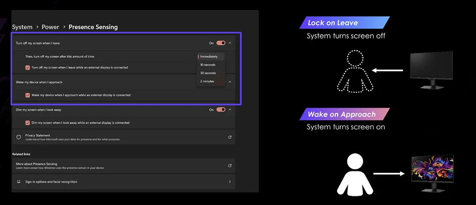 微星 OLED Care 3.0 在此前 2.0 版本的基礎(chǔ)上新增了基于 NPU 的 AI 人在監(jiān)測(cè)系統(tǒng):其配備了始終開啟的 CMOS 傳感器,每 0.2s 進(jìn)行一次拍攝,通過 NPU 在本地確認(rèn)是否存在人體,如用戶離開屏幕可自動(dòng)關(guān)機(jī)或進(jìn)入屏幕保護(hù)模式,最大程度減少燒屏風(fēng)險(xiǎn)并可顯著降低能耗。這一系統(tǒng)也可在用戶視線偏離時(shí)自動(dòng)降低屏幕亮度。