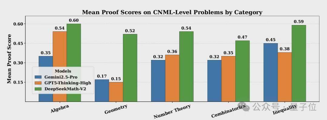 與此同時,DeepSeekMath-V2在所有CNML級別問題類別(代數、幾何、數論、組合學、不等式)上均優于GPT-5-Thinking-High和Gemini 2.5-Pro。