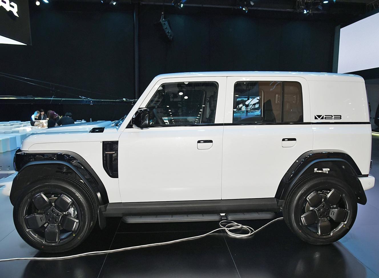 再來看新車的車身側面部分,車身部分的造型為方正的“方盒子”造型,視覺效果就像是大家熟悉的鈴木吉姆尼的造型相似,并且垂直的車窗以及平直的尾門造型,看起來更加的硬朗霸氣,半隱藏式的車門把手以及前方葉子板黑色飾板的鑲嵌,年輕的造型迎合了年輕消費者的審美,輪眉部分為外擴明顯的黑色飾板裝飾,車裙底部還有著黑色車裙以及腳踏板造型裝飾,搭配多幅式的黑色輪轂造型,運動感也是很濃郁的。車身尺寸方面,長寬高分別為4220/1915/1845毫米,軸距2735毫米,接近角42度/43度、離去角40度/41度、涉水深度600毫米、最小離地間隙200毫米/210毫米。