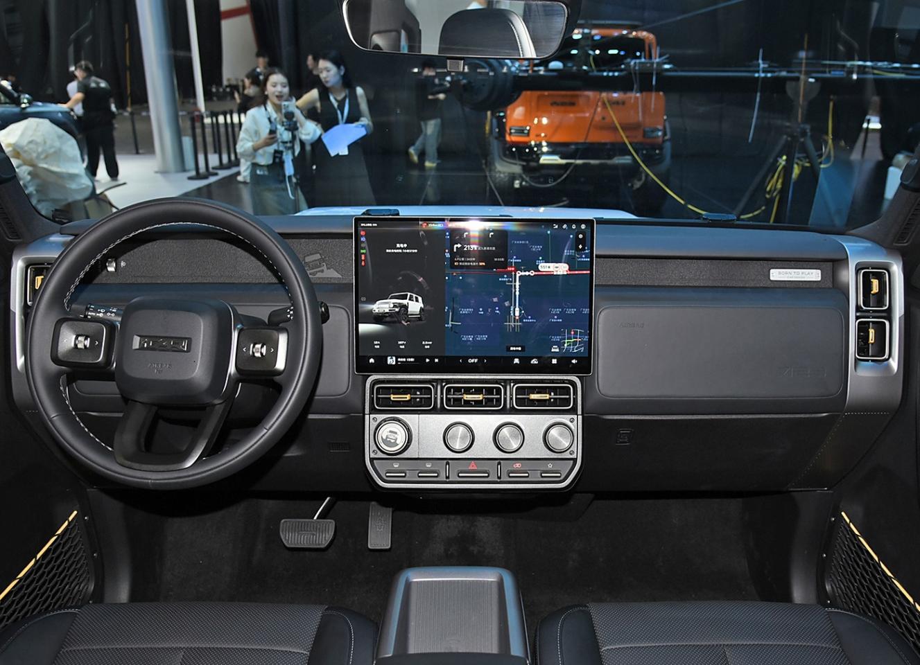進入車內,新車內飾的造型有著厚重的質感與平直的視覺效果,主副駕地板為貫通式處理,車內A/B柱裝配了把手,與外觀的硬派風格相呼應。并且中央配備15.4英寸的2.5K中控屏,內置8155芯片,支持蘋果CarPlay手機無線互聯。流暢的操作以及超清辨識度都很不錯,而且提供圓形的三輻多功能方向盤還有著不錯的手感,并且懸浮式中央扶手箱、拓展置物臺、手機無線充電板,并采用懷擋及無儀表盤設計。有著很濃郁的科技感。